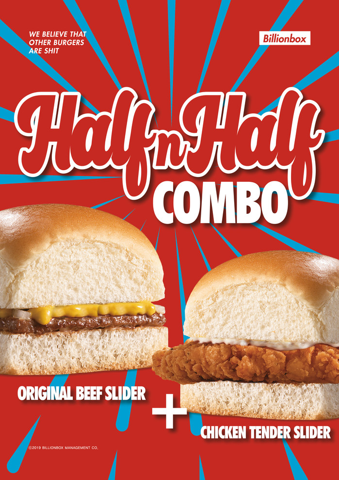 ‘하프앤하프 콤보’는 비프 슬라이더와 텐더 슬라이더를 한 번에 담은 콤보 메뉴로 빌리언박스의 시그니처 메뉴인 소고기 패티가 들어간 싱글 슬라이더와 크리스피 텐더가 들어간 슬라이더, 사이드 메뉴 감자튀김과 탄산음료로 구성되어 있다.
