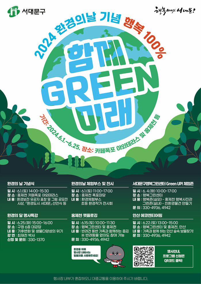 세부 행사 내용과 프로그램 참여 방법 등 자세한 내용은 포스터의 QR코드에 접속하거나 서대문구청 기후환경과로 문의하면 된다.