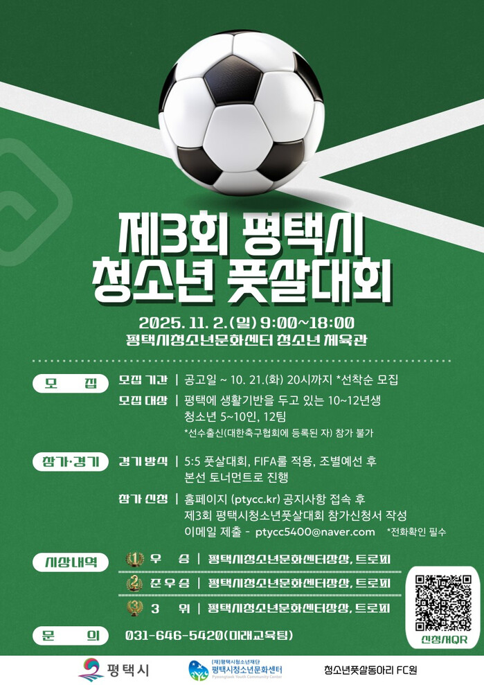 참가 문의 및 풋살대회 관련 자세한 내용은 평택시청소년문화센터 누리집 또는 미래교육팀으로 하면 된다.