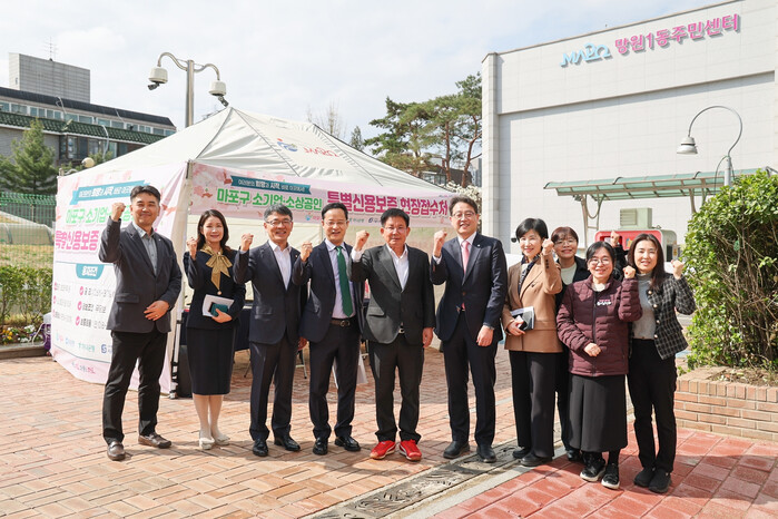 | ▲ 박강수 구청장과 관계자들이 ‘찾아가는 특별신용보증 현장접수처’ 운영을 기념해 기념촬영을 하고 있다. (사진=마포구청 제공) |