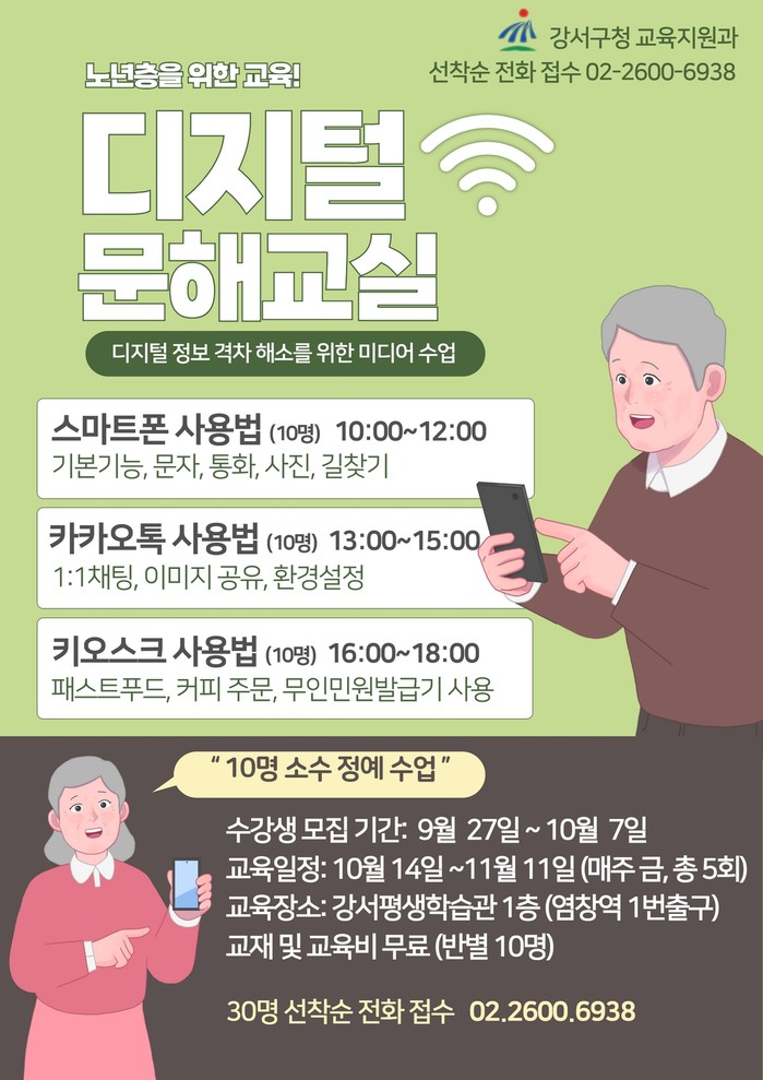 [시민일보 = 홍덕표 기자] 서울 강서구(구청장 김태우)가 오는 10월14일부터 11월11일까지 강서평생학습관 1층 강의실에서 스마트폰, 키오스크 등 디지털 기기 사용에 어려움을 겪을 노인들을 위한 '디지털 문해교실'을 운영한다.