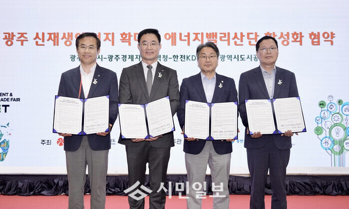 광주광역시(시장 강기정)는 9일 김대중컨벤션센터에서 광주경제자유구역청(청장 선석기), 한전KDN㈜(사장 박상형), 광주도시공사(사장 김승남)와 ‘광주지역 신재생에너지 확대 및 에너지밸리산단 활성화를 위한 업무협약(MOU)’을 체결했다.
