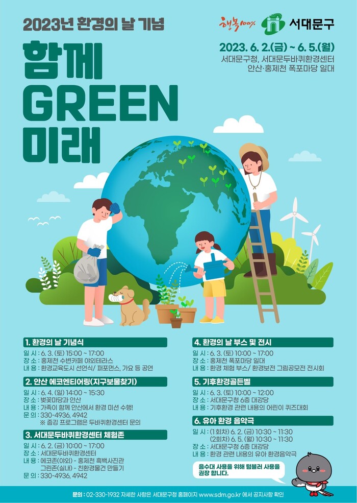 [시민일보 = 홍덕표 기자] 서울 서대문구(구청장 이성헌)가 환경의날(6월5일)을 기념해 오는 6월2~5일 지역내 홍제천 일대에서 '함께 GREEN 미래' 행사를 개최한다.