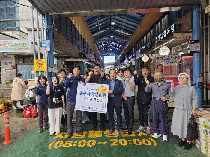 현대제철은 24일 동구지역 복지시설 10개소에 각 100만원 상당의 동구사랑 상품권을 전달하는 행사를 현대시장에서 가졌다. 전달된 상품권은 현대시장에서 모두 사용되며 이를 통해 복지관과 전통시장 모두 상생할 수 있도록 하는 행사이다.