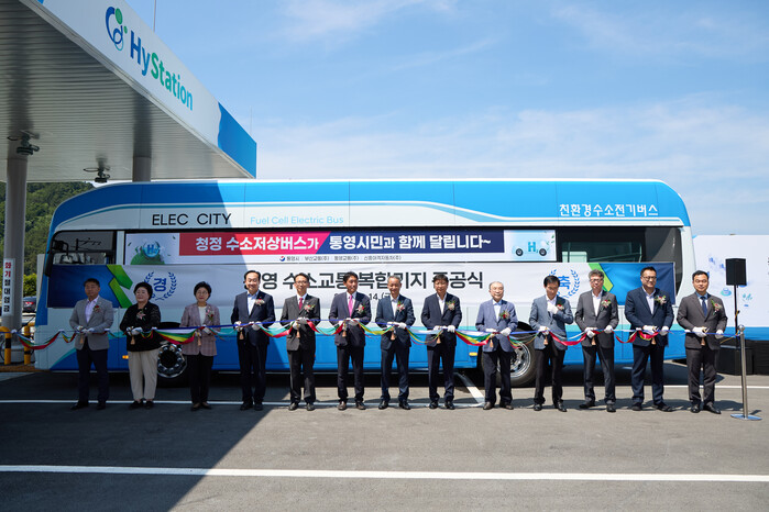 수소교통복합기지 준공식은 지난 14일 오후 김명주 경남도 경제부지사, 천영기 통영시장, 버스운송회사 대표 등이 참석한 가운데 열렸다.