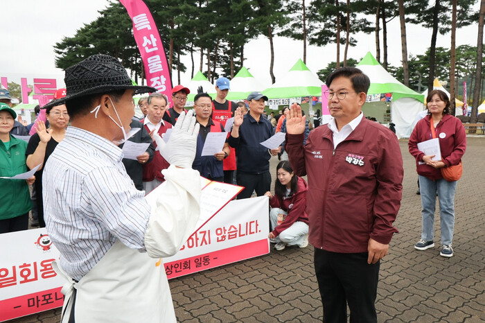 박강수 서울 마포구청장은 지난 18일 제18회 마포나루 새우젓축제 장터에서 열린 ‘1회용품 사용 안 하기’ 캠페인에 참여했다. 캠페인은 제18회 마포나루 새우젓축제 운영 기간 동안 1회용품 사용 자제, 원산지·가격 표시, 위생·안전 관리, 쓰레기 분리배출 등 건전한 축제 문화 확산을 목표로 마련됐다. 사진은 박 구청장(오른쪽)과 홍일표 광천토굴 새우젓 판매 상인이 ‘1회용품 사용 안 하기’ 캠페인 선서를 하고 있는 모습. (사진=마포구청 제공)