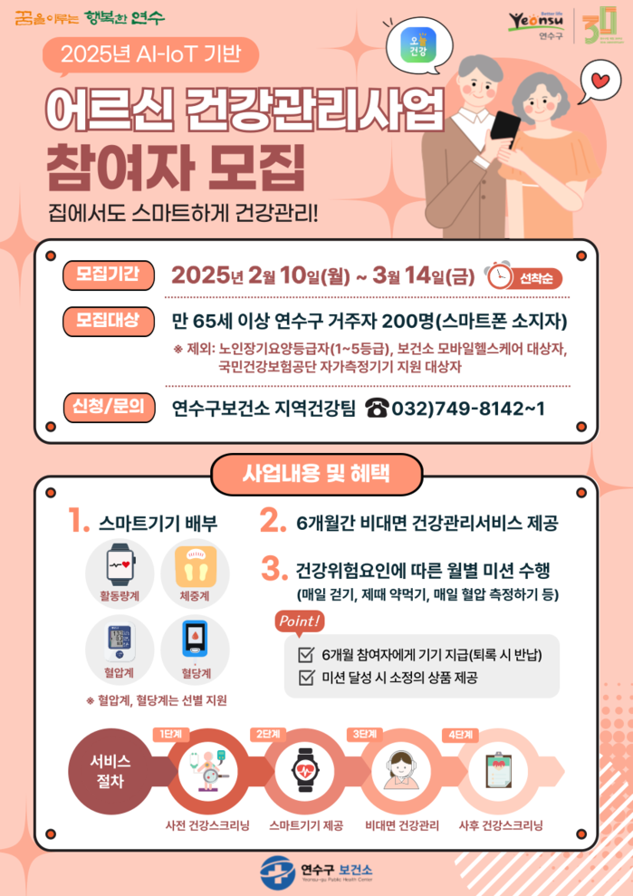 사업 대상은 앱 설치가 가능한 본인 명의 스마트폰을 소지한 만 65세 이상 연수구민 200명으로, 참여를 희망하는 대상자는 연수구보건소 지역건강팀으로 전화 신청하면 된다.
