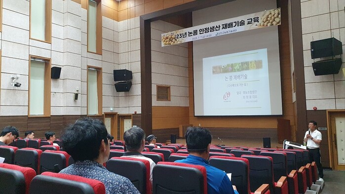 이날 교육은 지난 3월 24일 1차 교육에 이은 두 번째 시간으로, 최근 논콩으로 유명세를 떨치고 있는 나주시 알곡영농조합법인 대표이사 겸 국립식량과학원 현장 명예연구관인 최정웅 대표를 초빙해 실제 사례 교육 위주로 진행됐다.