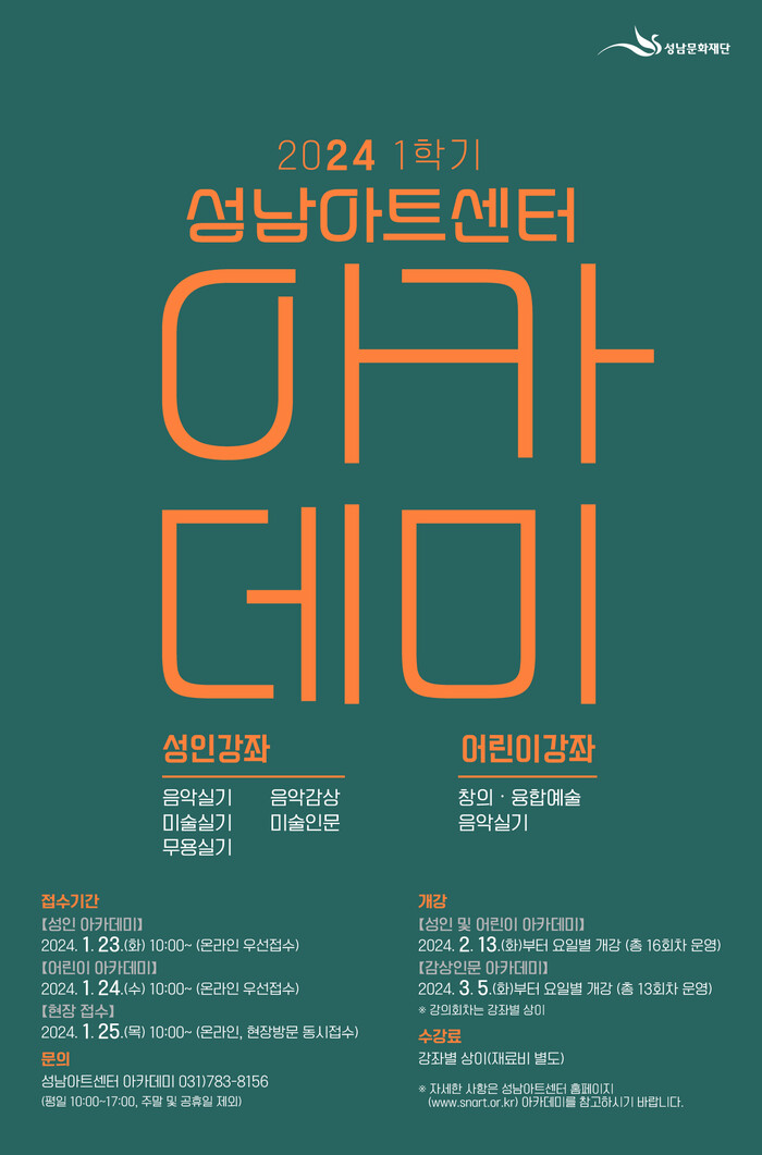 2024년 성남아트센터 아카데미 1학기 강좌는 오는 23일 성인강좌 온라인 접수를 시작으로 24일에는 어린이 강좌, 다음날인 25일은 현장 및 온라인 동시 접수하며 강좌별로 선착순 마감한다.