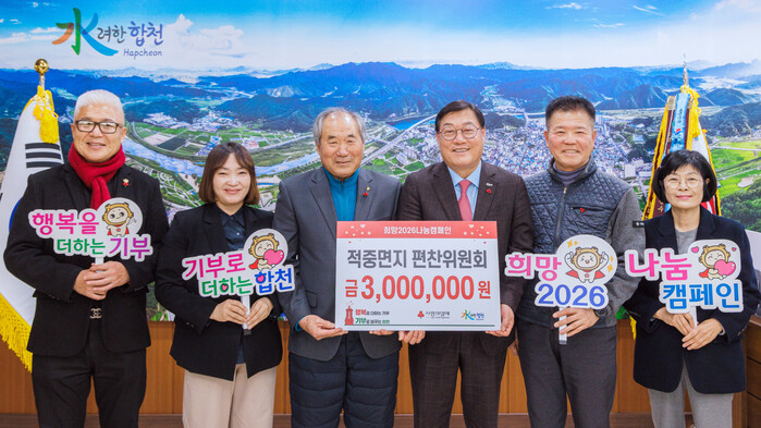 [합천=이영수 기자] 합천군은 지난 8일, 합천군 적중면지 편찬위원회에서 합천군청을 방문해 이웃돕기 성금 300만원을 기탁했다고 밝혔다.