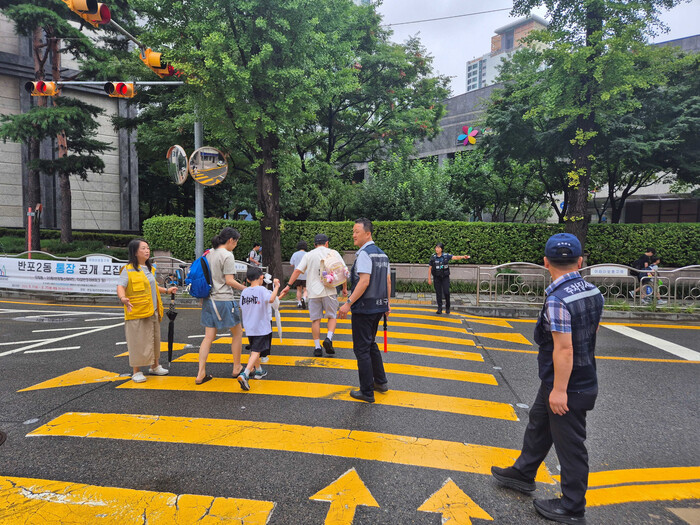 | ▲ 잠원초등학교 앞 방배경찰서 합동단속 현장 모습. (사진=서초구청 제공) |