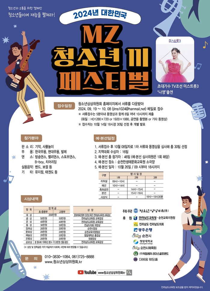순천시교육지원청(교육장 허동균)은 오는 26일 토요일 전국 MZ청소년을 위한 문화예술 공연 축제인 “2024년 대한민국 MZ청소년 끼 경연대회”가 전라남도교육청 산하 순천만생태문화교육원 공연장에서 오전 10시부터 개최한다고 전했다.