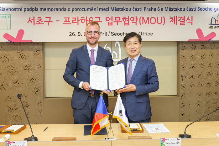 [시민일보 = 박소진 기자] 서초구(구청장 전성수)가 최근 구청 5층 대회의실에서 체코 프라하 6구와 문화, 예술, 교육 분야 등 상호 교류 우호증진을 위한 우호도시협정 양해각서(MOU)를 체결했다고 29일 밝혔다.