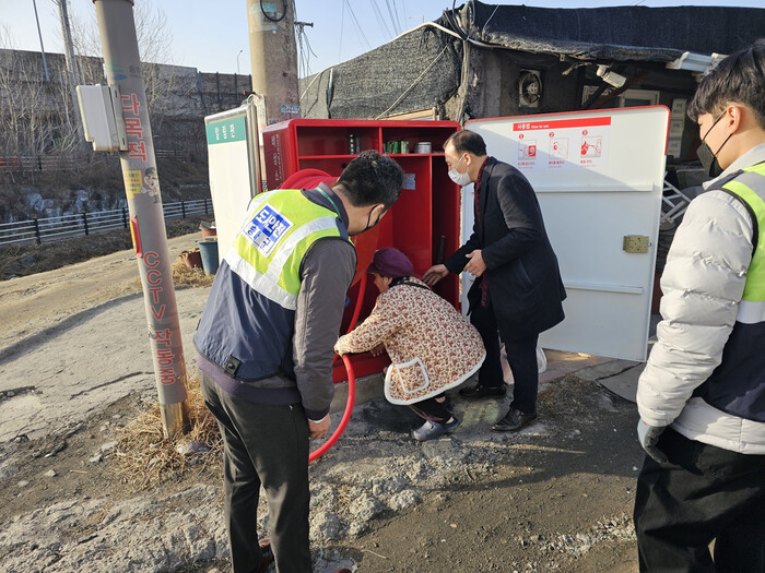 | ▲ 송파구가 장지동 화훼마을에 방문해 가스유출 여부 및 소화기 내구 연한 등을 확인하며, 화재 예방 점검을 하고 있다. (사진=송파구청 제공) |
