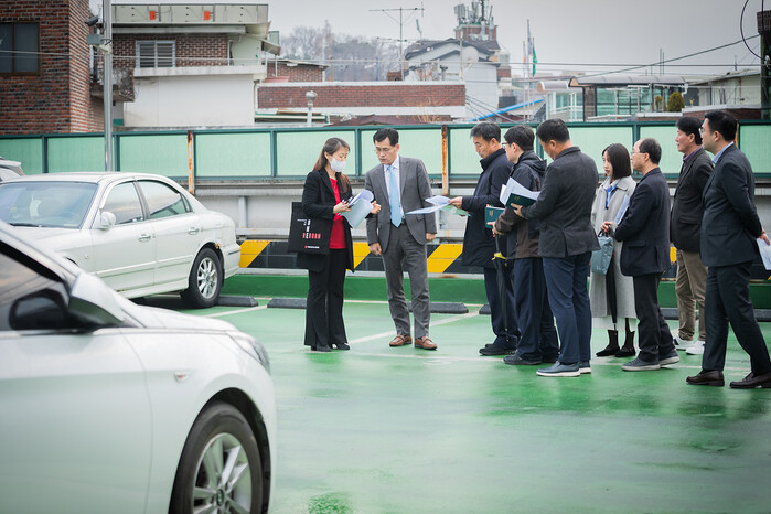 | ▲ 이기재 구청장(왼쪽 두 번째)이 통합주차관제 고도화 대상지 공영주차장에 방문했다. (사진 = 양천구청 제공) |