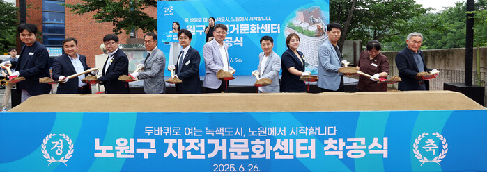 오승록 서울 노원구청장이 최근 중계동 504-8번지 현장에서 열린 ‘노원 자전거문화센터’ 착공식에 참석했다. ‘자전거문화센터’는 자전거에 대한 올바른 인식과 안전한 이용문화를 확산하기 위해 서울시 자치구 중 최초로 조성되는 자전거테마공간이다. 사진은 오 구청장(가운데)이 첫 삽을 뜨며 기념 촬영을 하는 모습. (사진=노원구청 제공)