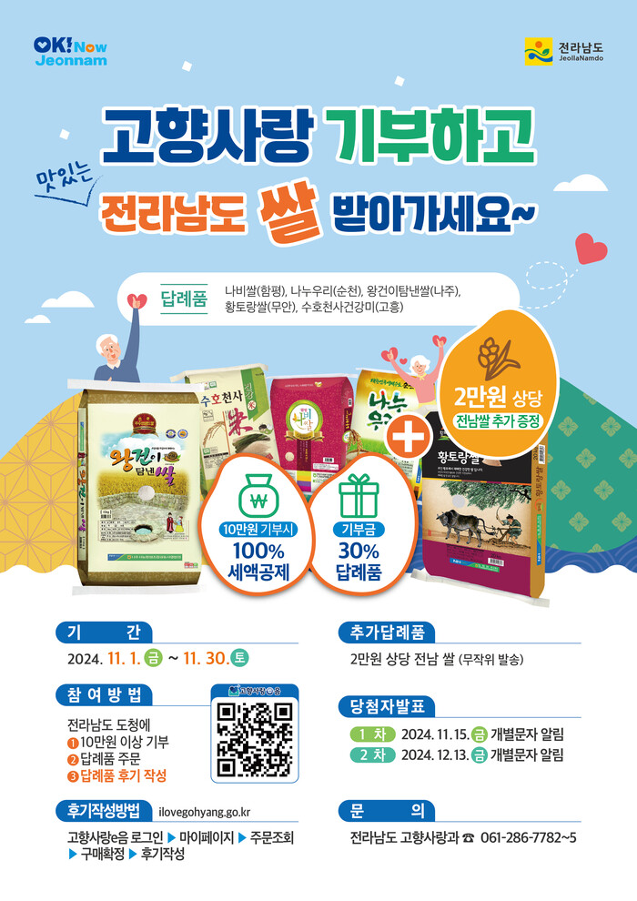 도 관계자는 “이번 이벤트는 많은 기부자 덕에 전남 쌀 소비 촉진으로 이어져 전남 농가에 큰 도움이 됐다”며 “12월에도 전남 어르신들이 직접 담근 김장김치를 추가 답례품으로 제공하는 이벤트를 진행 중이니 많은 관심 바란다”고 당부했다.