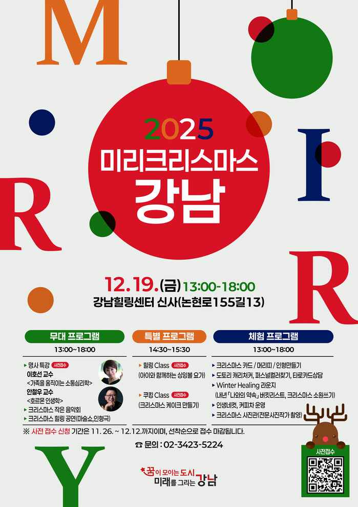 [시민일보 = 이대우 기자] 강남구(구청장 조성명)가 연말을 맞아 주민들에게 따뜻한 위로와 활력을 전하기 위해 강남힐링센터 신사에서 오는 19일 오후 1~6시 특별 행사 ‘2025 미리크리스마스 강남’을 개최한다.