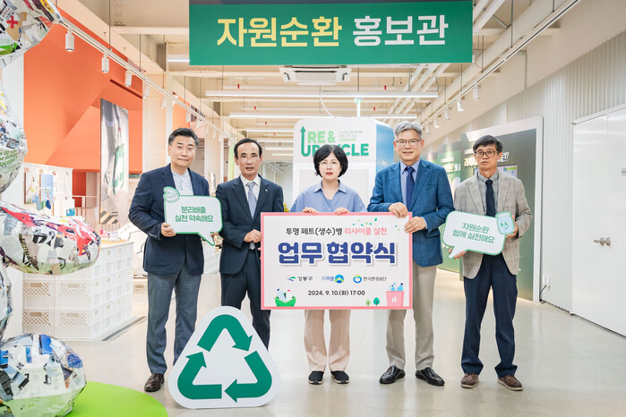 [시민일보 = 이대우 기자] 서울 강동구(구청장 이수희)가 최근 강동구 리앤업사이클플라자에서 스파클(주) 및 한국환경공단과 함께 투명 페트병(생수병) 재활용 활성화를 위한 상호 업무협약을 체결했다.
