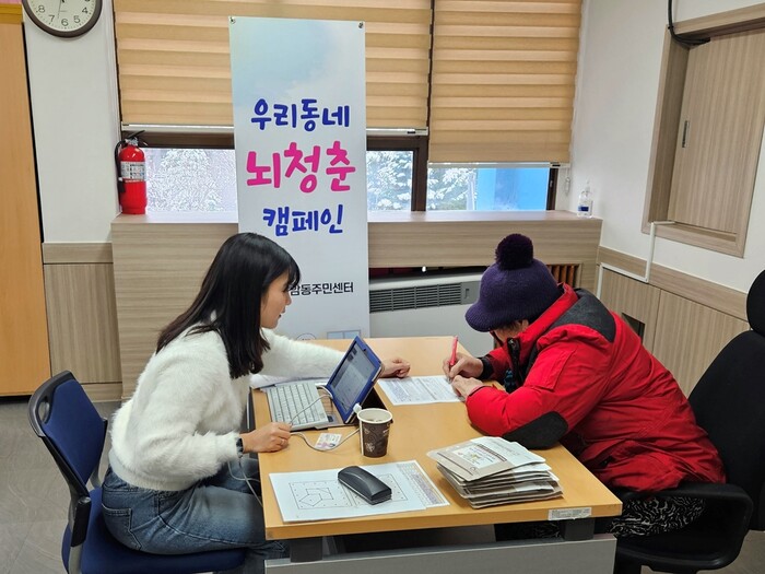 경기 의정부시 장암동 주민센터가 최근 치매안심센터와 함께 ‘뇌청춘 캠페인’을 진행했다. 이번 캠페인에서는 14명의 대상자에게 치매 조기 검진(CIST)과 관련 건강상담을 제공했다. 사진은 대상자가 건강상담을 진행하고 있는 모습. (사진=의정부시청 제공)