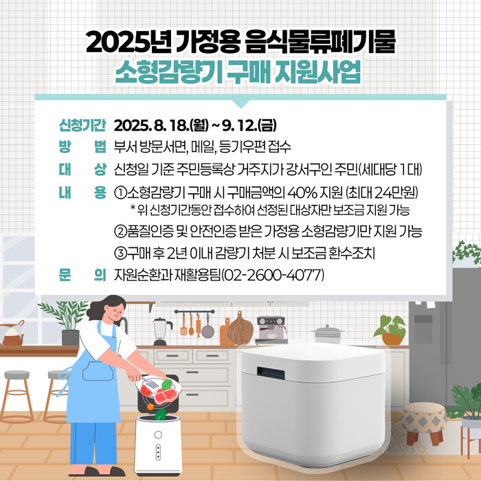 [시민일보 = 박소진 기자] 서울 강서구(구청장 진교훈)가 ‘2025년 가정용 음식물류폐기물 소형감량기 구매 지원사업’을 본격 시작한다고 6일 밝혔다.