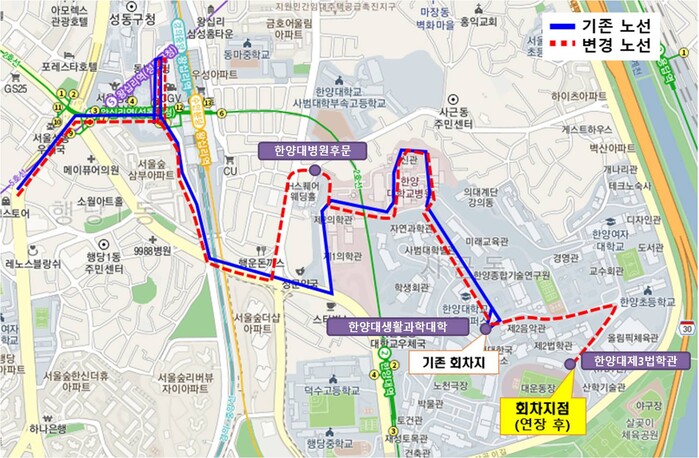 이번 노선조정으로 회차지점을 한양대생활과학대학에서 제3법학관까지 변경하고, 법학학술정보관, 올림픽체육관, 제3법학관(회차), 경영대학을 거쳐 한양대병원 후문을 경유해 운행하게 된다.