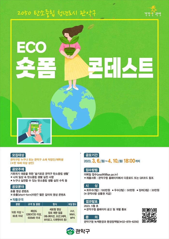 [시민일보 = 박준우 기자] 서울 관악구(구청장 박준희)가 구민들로부터 기후위기, 탄소중립에 대한 공감을 이끌어냄과 동시에 탄소중립 관악을 실현하고자 '탄소중립 ECO 숏폼(Short-form) 콘테스트’를 공모한다고 29일 밝혔다.