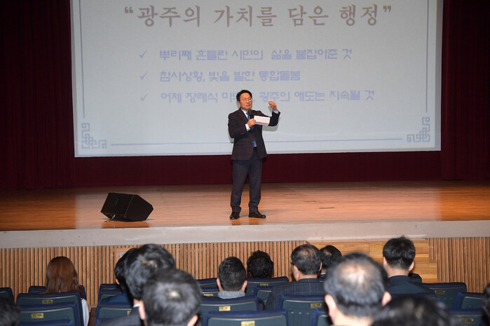 강 시장은 이어 공직자들에게 애도와 더불어 무너진 일상을 회복해야 할 때임을 강조했다. 꽁꽁 얼어붙은 민생경제 회복을 위한 경제정책과 인공지능, 미래차 등 산업정책의 차질 없는 추진은 물론 ‘광주다움 통합돌봄’ 등 소외된 이웃이 없는 돌봄정책 지원 등을 당부했다.