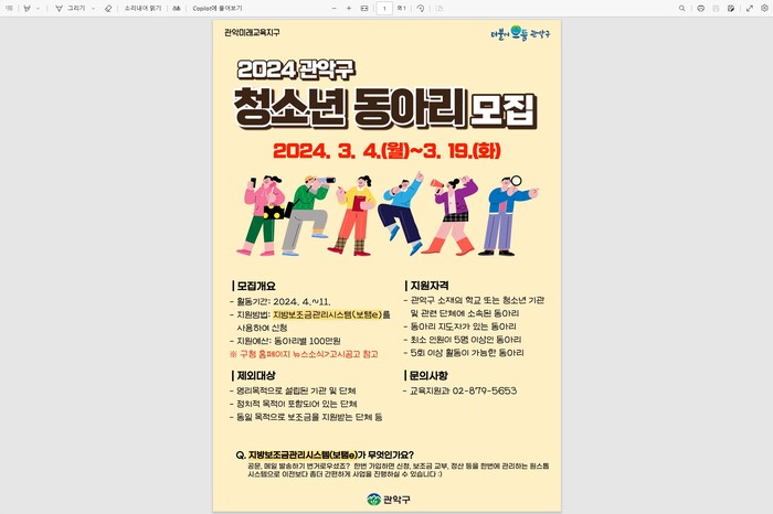 [시민일보 = 여영준 기자] 서울 관악구(구청장 박준희)는 오는 19일까지 지역내 청소년 동아리를 모집한다고 밝혔다.