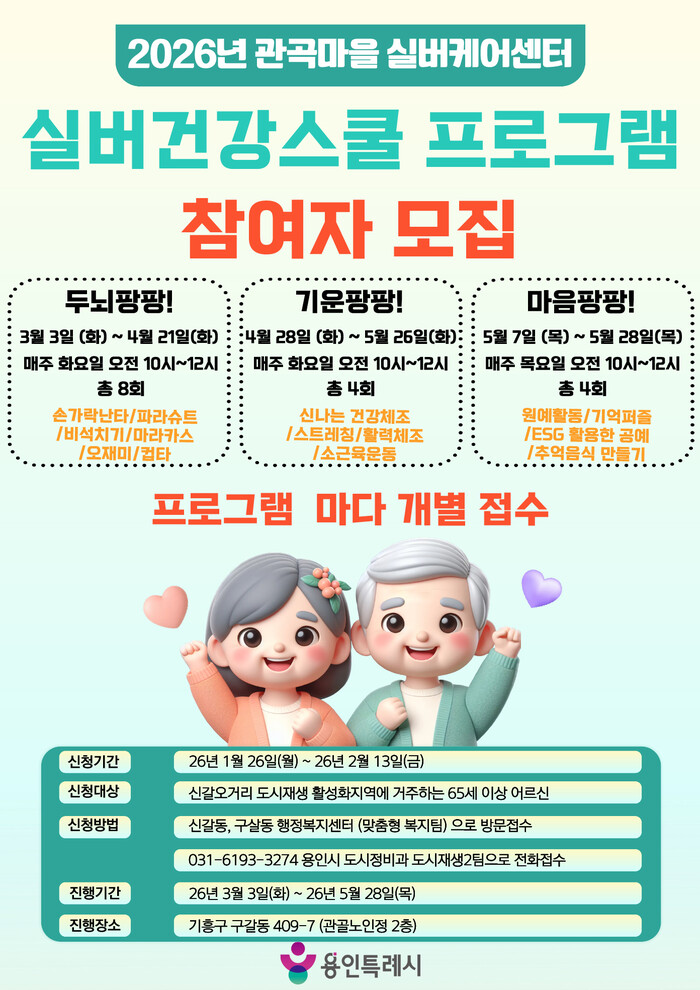 [용인=오왕석 기자] 용인특례시(시장 이상일)는 ‘관곡마을 실버케어센터 실버건강 프로그램’ 참가자를 13일까지 모집한다.