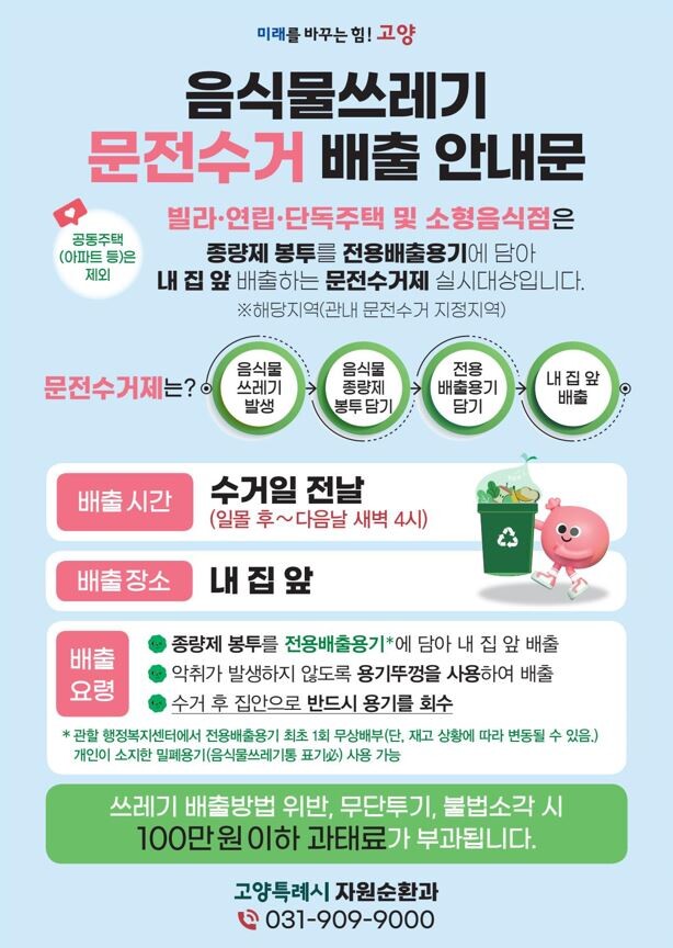 [시민일보 = 민장홍 기자] 경기 고양시가 ‘음식물쓰레기 문전수거제’ 실시지역을 대상으로 문전배출에 대한 시민들의 이해와 협조를 돕기 위한 배출 안내문을 행정복지센터에 배부해 적극적인 홍보를 실시한다고 밝혔다.