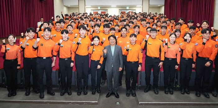| ▲ 강기정 광주광역시장이 6일 오전 광산구 광주소방학교를 방문해 신임 소방사들을 대상으로 특강을 마친 뒤 기념촬영을 하고 있다./광주광역시 제공 |