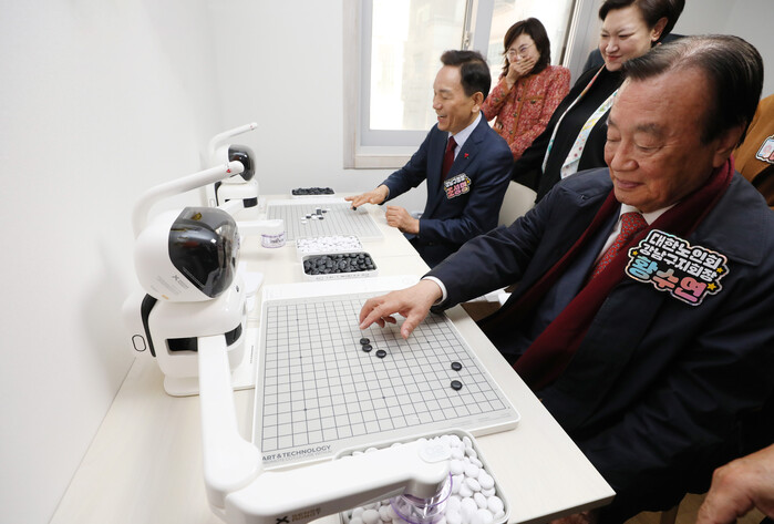 | ▲ 조성명 구청장이 로봇과 바둑두기 체험을 해보고 있다.(사진=강남구청 제공) |