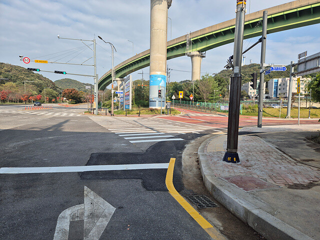 구체적으로 신호등과 가로등을 이설하고, 가각부에 있는 보도를 약 1m 축소함으로써, 버스 차량이 진입하는 데 불편함이 없도록 조치했다.