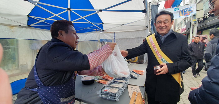 이충우 경기 여주시장은 5일 설을 맞아 전통시장인 한글시장과 세종시장을 방문했다. 이 시장은 명절 성수품을 구입하고 시장을 돌며 상인들의 애로사항과 현안사항에 대해 의견을 청취했으며, 시민들과 인사를 나눴다. 사진은 이 시장(오른쪽)이 전통시장에서 물건을 구매하고 있는 모습. (사진=여주시청 제공)