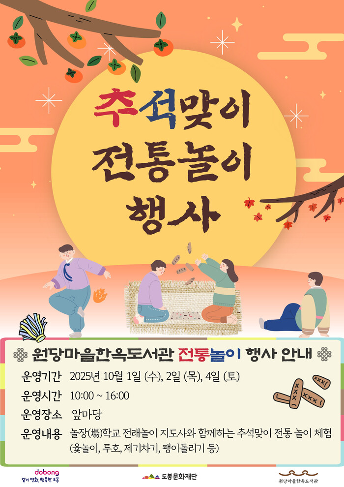 [시민일보 = 문민호 기자] 도봉구(구청장 오언석) 도봉문화재단 원당마을한옥도서관은 도서관 앞마당 및 툇마루에서 ‘추석맞이 전통 놀이 행사’를 개최한다고 29일 밝혔다.