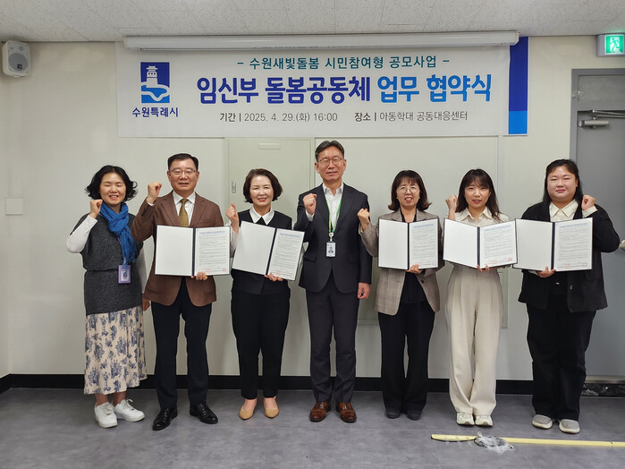 경기 수원시가 29일 수원시 아동학대 공동대응센터에서 ‘수원새빛돌봄 임신부 돌봄공동체 지원사업’ 선정기관 ▲광교종합사회복지관 ▲(사)수원YWCA ▲수원시건강가정지원센터 ▲수원시사회적기업협의회 ▲영통종합사회복지관 등 5곳과 협약을 체결했다. 사진은 협약식 후 참석자들이 기념 촬영을 하는 모습. (사진=수원시청 제공)