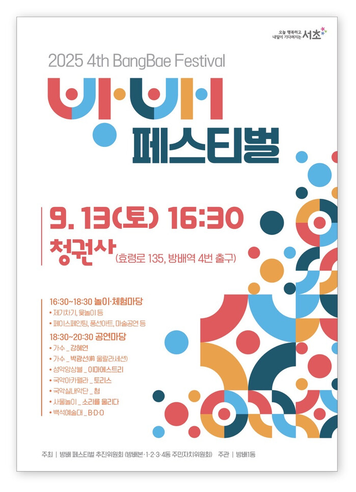[시민일보 = 박소진 기자] 서초구(구청장 전성수)는 오는 13일 방배역 인근에 위치한 청권사(효령로 135)에서 지역 주민과 함께하는 ‘제4회 방배 페스티벌’을 개최한다고 밝혔다.