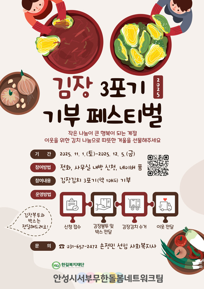 [안성=오왕석 기자] 사회복지법인 한길복지재단(이사장 한창섭)에서 수탁 운영중인 안성시서부무한돌봄네트워크팀(센터장 유성아)은 다가오는 김장철을 맞아 오는 11월 1일부터 12월 5일까지 ‘김장 3포기 기부 페스티벌’에 참여할 안성시민, 지역기관·단체의 신청을 받는다.