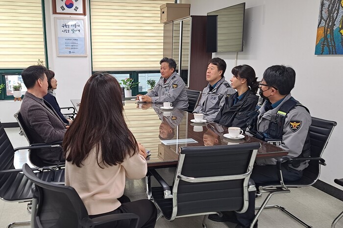 경기 수원시 영통구 매탄4동은 21일 장대현 주민자치회장과 함께 지역내 유관기관인 매탄지구대와 간담회를 개최했다. 간담회에서 지역내 사건·사고 발생 및 각종 협업사항 등에 대해 유기적인 협조체계 구축 및 협조를 당부하고 지역 현안사항에 대해 논의했다. 사진은 이날 간담회가 진행되고 있는 모습. (사진=영통구청 제공)