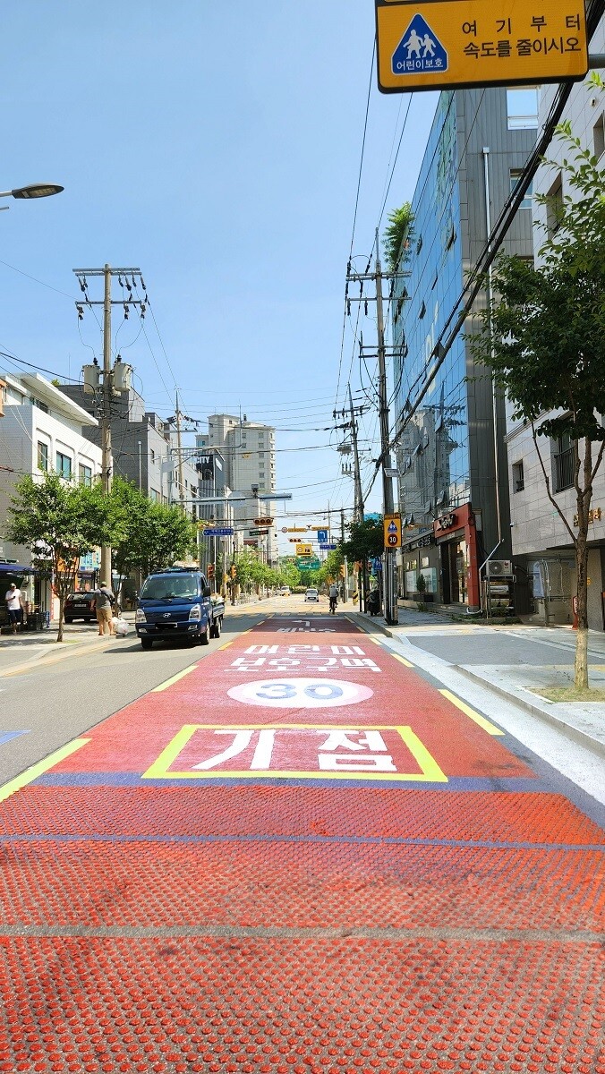 17일 구에 따르면 ‘도트무늬 미끄럼방지포장’은 운전자에게 ‘여기부터 어린이 보호구역’이 시작된다는 사실을 효과적으로 인지시키기 위한 것으로, 어린이 보호구역 시작 부근 3m 구간 도로 표면에 도트무늬 요철 형태로 포장을 해, 보호구역 시점부 주행 시 차량의 진동을 운전자가 직접 몸으로 느낄 수 있도록 했다.