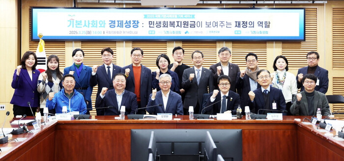 경기 파주시가 지난 25일 국회에서 열린 ‘국회 기본사회포럼’에서 민생회복 생활안정지원금 등 기본사회 정책 우수사례를 발표했다. 사진은 포럼에 참석한 김경일 시장(앞줄 왼쪽 두 번째)이 관계자들과 기념 촬영을 하는 모습. (사진=파주시청 제공)