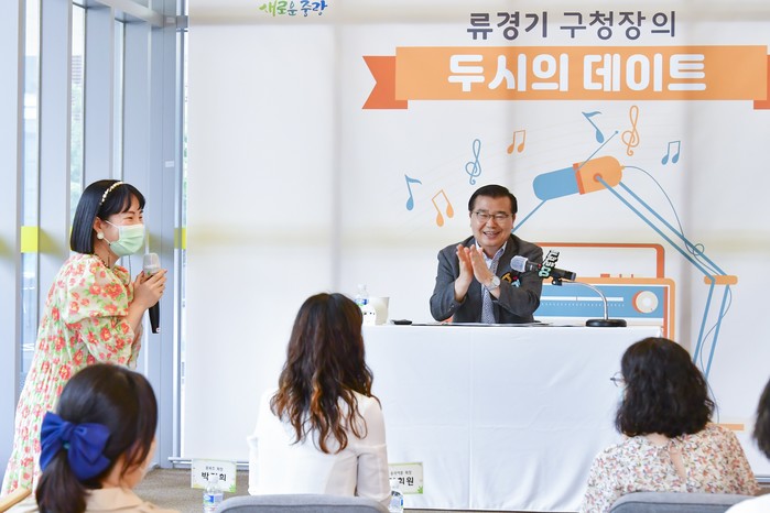 | ▲ 25일 오후 중랑구 방정환교육지원센터에서 열린 두시의 데이트에서 류경기 구청장이 참여자들과 이야기를 나누고 있다. (사진제공=중랑구청) |