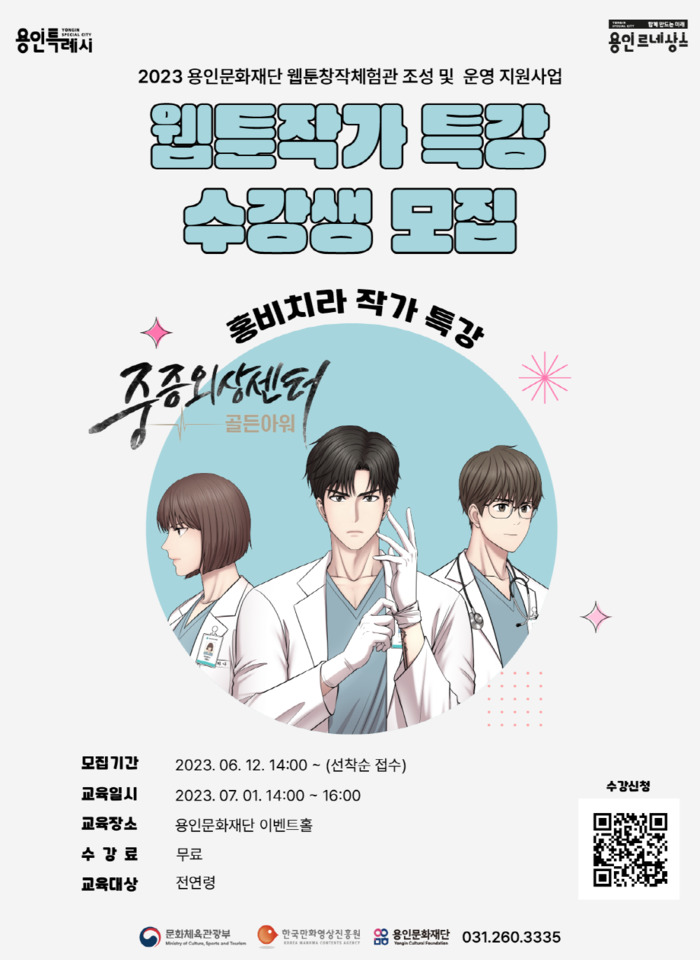 오는 7월 1일 진행되는 ‘몽글몽글, 웹툰 작가의 꿈 : 웹툰 작가 특강’에서는 네이버 인기 웹툰이자 OTT 드라마로 추진 중인 <중증외상센터 : 골든 아워>의 홍비치라 작가와 함께한다.