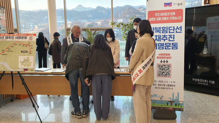 구는 강북횡단선이 중단되거나 종로 지역이 대안 노선에서 제외되지 않도록 지난 2월~4월3일 ‘주민 숙원사업 서명운동’을 펼쳤다. 이 서명운동에는 뜻을 함께하는 총 3만3763명이 서명에 참여했으며 이중 부암·평창동 주민은 6700명, 상명대학교 학생은 1357명이다.