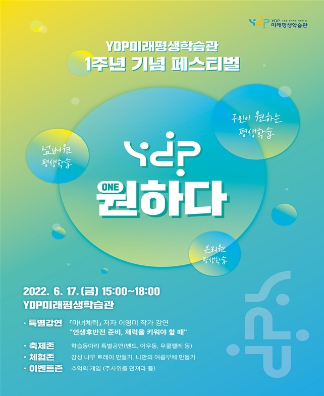 행사는 17일 오후 3~6시 대림동 YDP미래평생학습관에서 열린다. 축제존에서는 개관 1주년 기념 동영상 상영과 우수 학습동아리의 밴드, 전통춤 등 축하공연이 진행되며, ‘마녀체력’ 저자인 이영미 작가를 초청해 ‘인생후반전 준비, 체력을 키워야 할 때’를 주제로 특강을 연다.