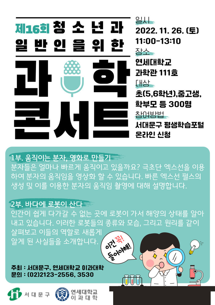 [시민일보 = 홍덕표 기자] 서울 서대문구(구청장 이성헌)가 연세대학교 이과대학과 함께 오는 26일 연세대 과학관 111호에서 '제16회 청소년과 일반인을 위한 과학콘서트'를 개최한다.