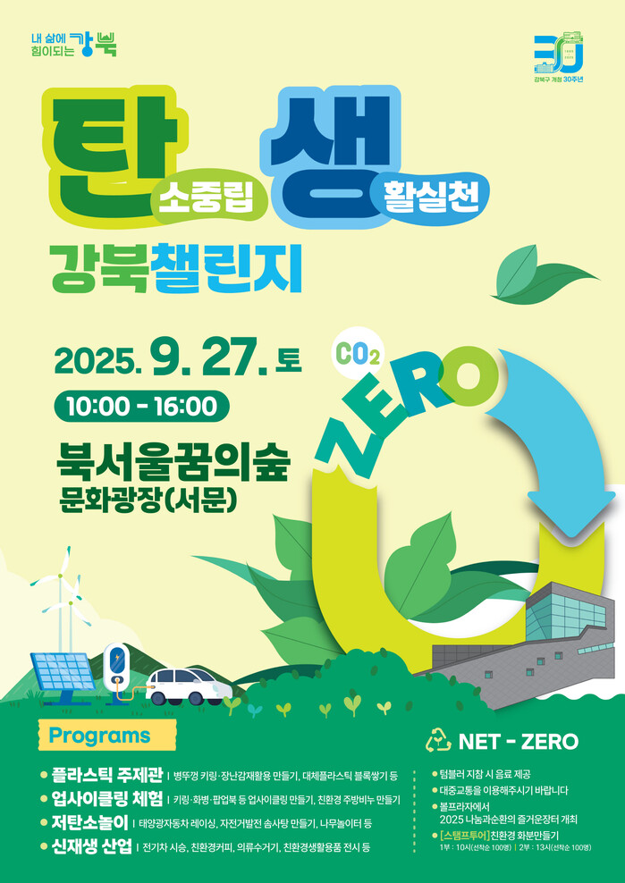 ‘탄생 강북 챌린지’의 ‘탄생’은 ‘탄소중립 생활실천’의 줄임말로, 이번 행사는 탄소중립 실천 약속을 비롯해 플라스틱 주제관 등 5개 마당 35개 체험 프로그램으로 구성된다.