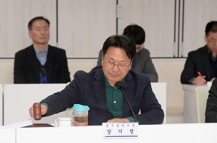 | ▲ 강기정 광주광역시장이 8일 오전 시청 중회의실에서 열린 2025년 제1차 노사민정협의회에 참석해 회의를 주재하고 있다. /광주광역시 제공 |