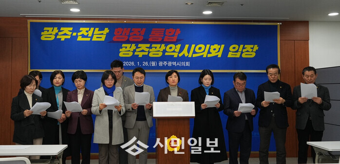 | ▲ 신수정 광주광역시의장(사진 가운데)이 시의원 등과 함께 26일 전라남도의회에 행정통합 주요 쟁점 논의를 위해 '광주전남특별시 설치를 위한 특별법'수정안을 발표하고 있다. / 광주광역시의회 제공 |